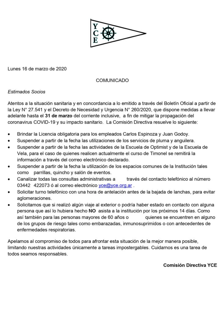 Lunes 16 de marzo de 2020 COMUNICADO Estimados Socios Atentos a la situación sanitaria y en concordancia a lo emitido a través del Boletín Oficial a partir de la Ley N° 27.541 y el Decreto de Necesidad y Urgencia N° 260/2020, que dispone medidas a llevar adelante hasta el 31 de marzo del corriente inclusive, a fin […]