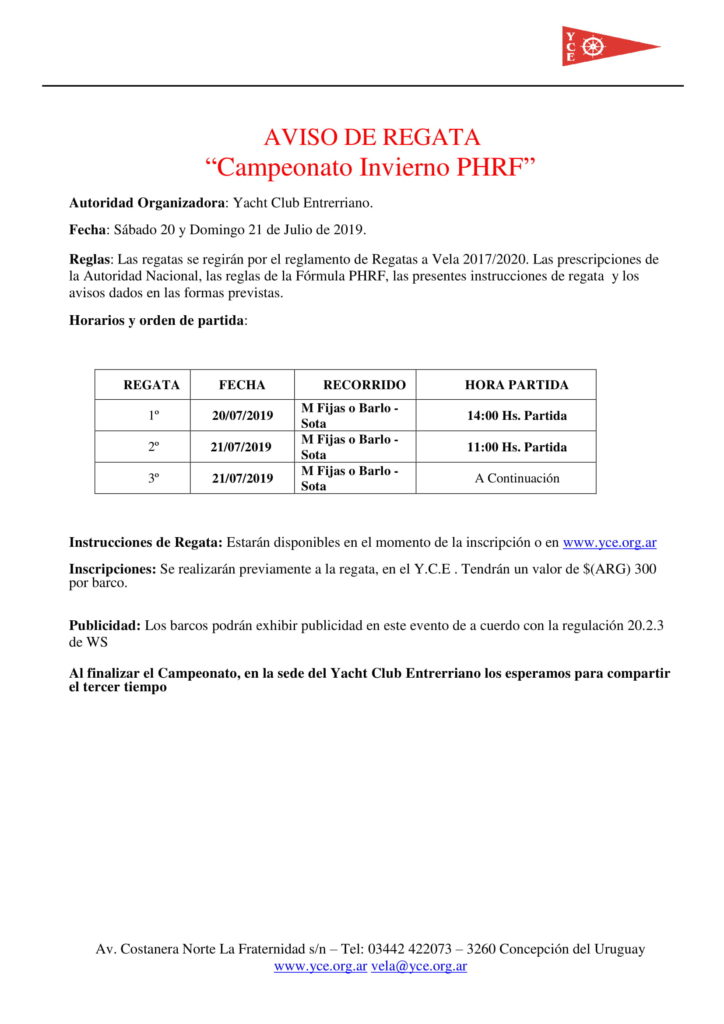 Aviso de Regata Instrucciones de Regata Galería de imágenes Resultado Regata Aniversario YCE 2019
