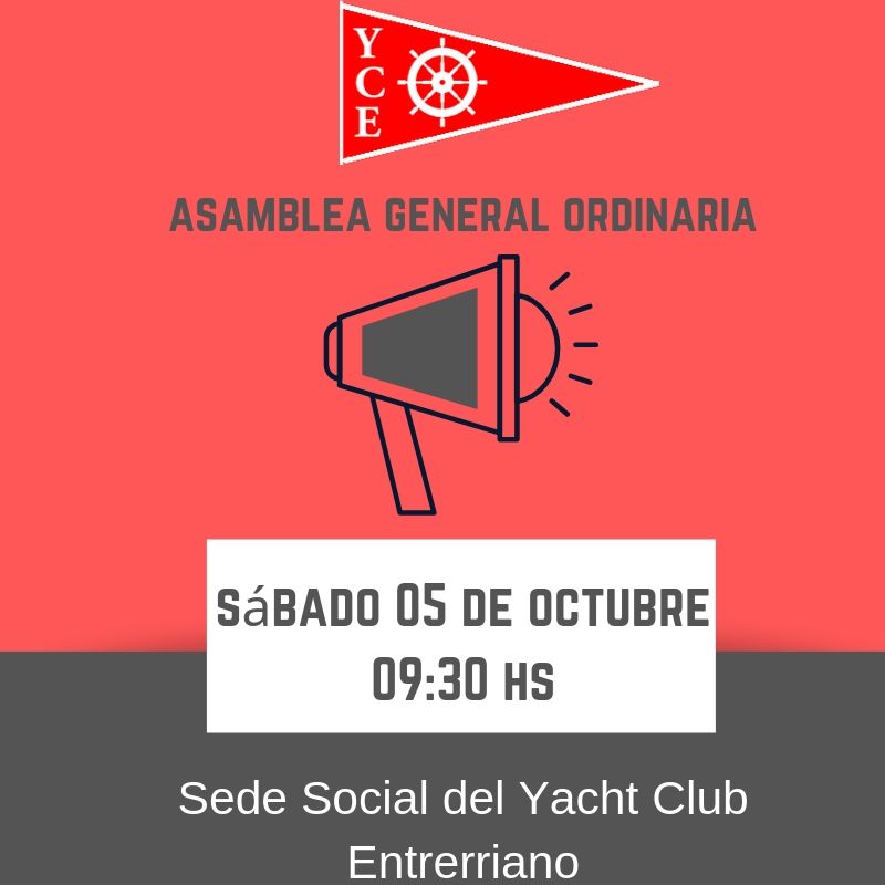Cumpliendo con lo dispuesto por los Estatutos Sociales se llama a Asamblea General Ordinaria de Socios para el día 05 de Octubre de 2019 a las 09:30 hs., a realizarse en la Sede Social del Yacht Club Entrerriano, sita en Margen Derecha Arroyo Molino S/N, para tratar el siguiente orden del día: 1) Lectura y […]